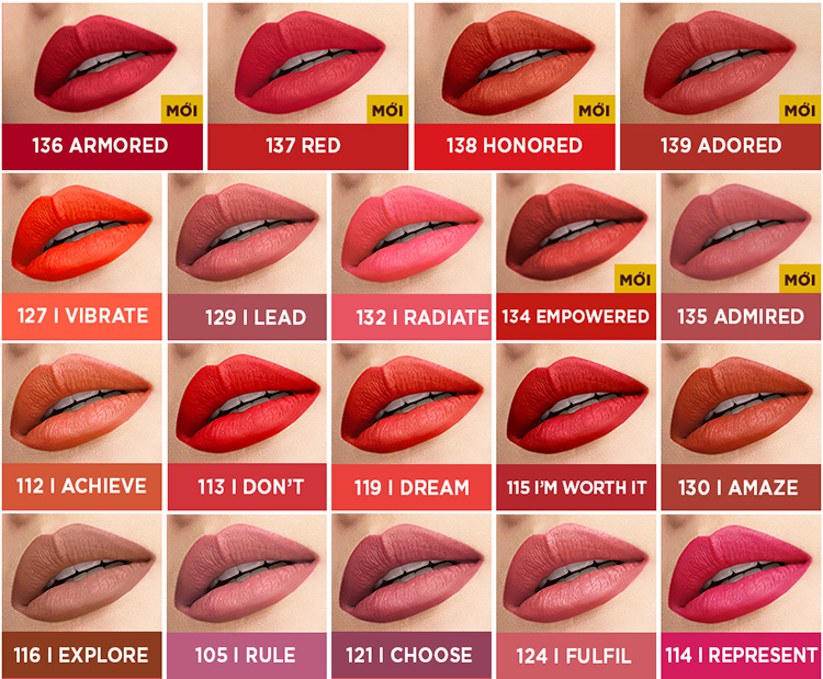 - Bảng màu son 12 tông khác nhau của L’Oréal Rouge Signature toàn những màu tươi tắn, tôn da sẽ khiến bạn không quá khó để chọn được màu ưng ý.
